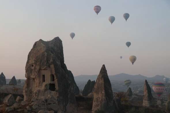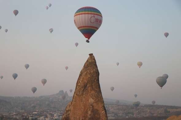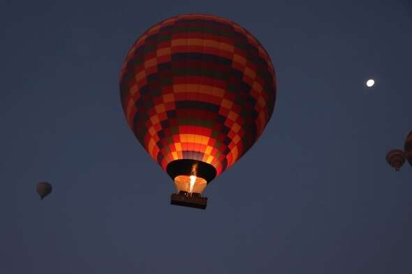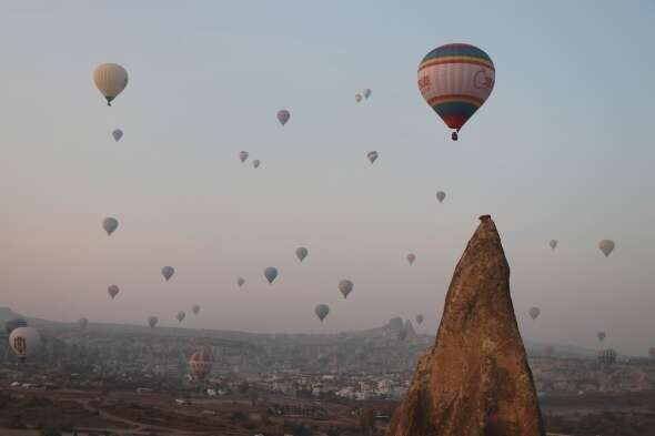 Sabahın ilk ışıklarıyla birlikte havalanan sıcak hava balon turlarına yerli ve yabancı turistler büyük ilgi gösterirken balonların görsel şöleni kendisine hayran bıraktı.