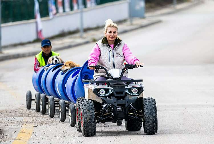 Yaşama Tutunan Patiler Derneği Başkanı Buket Özgünlü, ATV tarzı aracının arkasına bağladığı plastik varillerden yaptığı "tren"le engelli köpeklerini gezdiriyor.