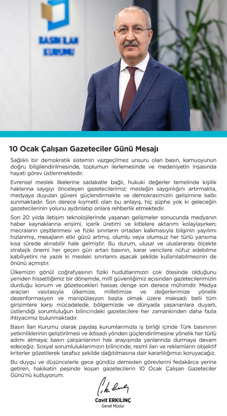 “Basın İlan Kurumu olarak paydaş kurumlarımızla iş birliği içinde Türk basınının yetkinliklerinin geliştirilmesi ve iktisadi yönden güçlendirilmesine yönelik her türlü adımı atmaya; basın çalışanlarının hak arayışında yanlarında durmaya devam edeceğiz. Sosyal sorumluluklarımızın bilincinde; resmî ilan ve reklamların objektif kriterler gözetilerek tarafsız şekilde dağıtılmasına dair kararlılığımızı koruyacağız. Bu duygu ve düşüncelerle gece gündüz demeden görevlerini fedakârca yerine getiren, hakikatin peşinde koşan gazetecilerin 10 Ocak Çalışan Gazeteciler Gününü kutluyorum.”