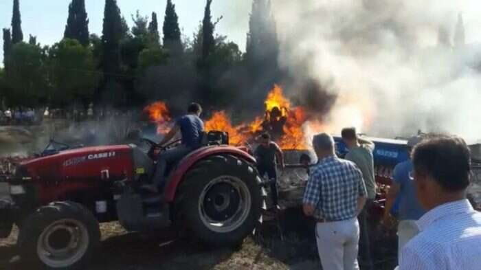 Bursa’da bir evin bahçesinde çocukların torpil patlatması yüzünden çıktığı iddia edilen yangında 16 tarım aleti kül oldu. Nilüfer'in Yolçatı Mahallesi’ne bir evin bahçesinde çocukların torpil patlatması neticesinde çıktığı iddia edilen yangın kısa sürede saman balyalarına sıçradı. Mehmet Özen’e ait alanda bulunan ilaçlama, gübreleme, tohumlama ve pulluktan oluşan 16 tarım aleti ile birlikte 100 tane sulama borusu büyük ölçüde zarar gördü. Olay yerine kısa sürede gelen 2 itfaiye aracı ve 1 dozer, alevler mezarlıktaki çam ağaçlarına sıçramadan yarım saat içinde yangını kontrol altına aldı. Vatandaşlar da araçlarında bulunan yangın söndürme tüpleri ve sulama tankerleri ile alevlere müdahale etti. Yangınla alakalı tahkikat devam ediyor. (İHA)