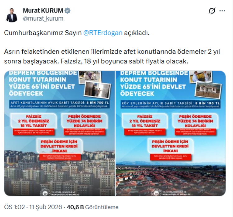 Çevre, Şehircilik ve İklim Değişikliği Bakanı Murat Kurum da ödeme planına ilişkin sosyal medya hesabından yaptığı açıklamada, "Cumhurbaşkanımız Sayın Recep Tayyip Erdoğan açıkladı. Asrın felaketinden etkilenen illerimizde afet konutlarında ödemeler 2 yıl sonra başlayacak. Faizsiz, 18 yıl boyunca sabit fiyatla olacak." ifadelerini kullandı.
