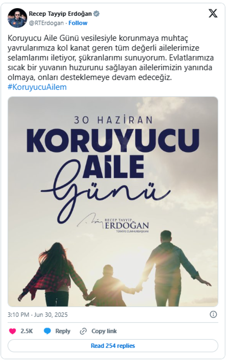 Cumhurbaşkanı Erdoğan, "30 Haziran Koruyucu Aile Günü" dolayısıyla sosyal medya hesabından paylaştığı mesajında, şunları kaydetti: