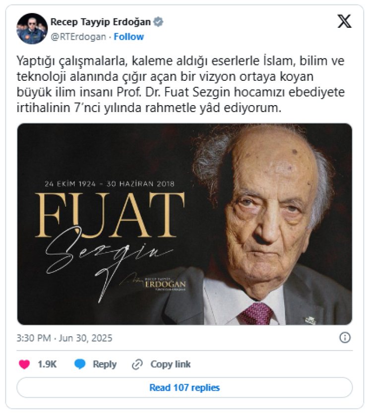 Cumhurbaşkanı Recep Tayyip Erdoğan, vefatının 7. yılında Prof. Dr. Fuat Sezgin'i rahmetle andı.