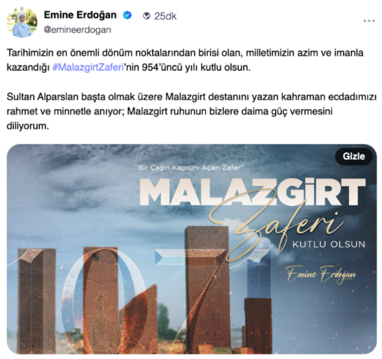 Emine Erdoğan'dan, Malazgirt Zaferi'nin 954'üncü yıl dönümü paylaşımı