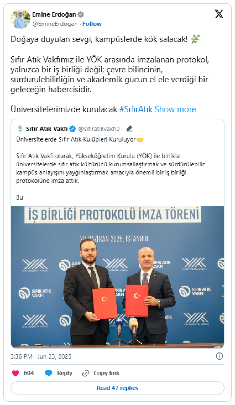 Emine Erdoğan, sosyal medya hesabından, Yükseköğretim Kurulu (YÖK) ile Sıfır Atık Vakfı arasında imzalanan "Üniversitelerde Sıfır Atık Uygulamaları İşbirliği Protokolü"ne dair paylaşımda bulundu.