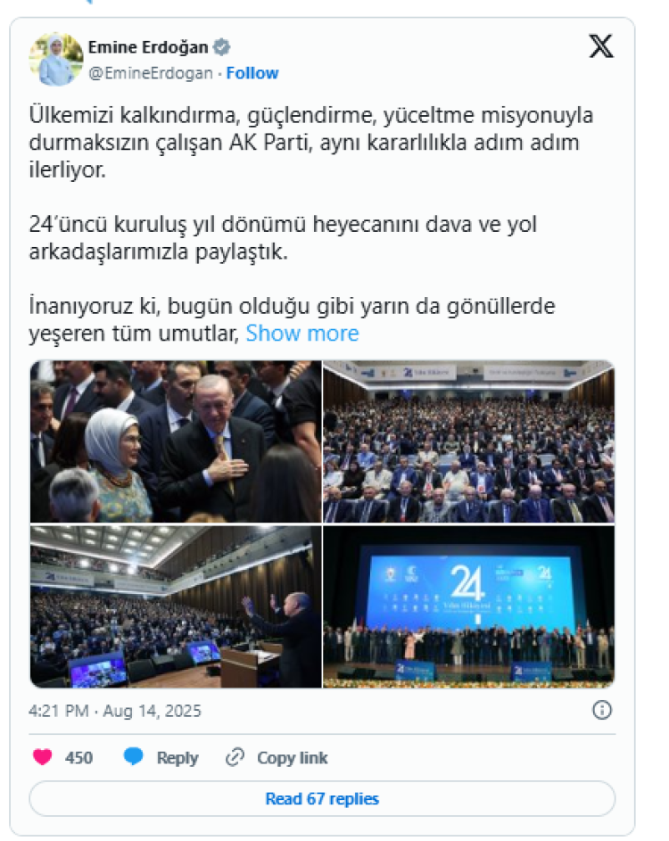 Emine Erdoğan, AK Parti'nin 24'üncü kuruluş yıl dönümü dolayısıyla düzenlenen programa ilişkin paylaşım yaptı.