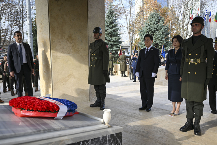 Lee ve eşi Kim Hea Kyung, Ankara'nın Altındağ ilçesindeki anıtı ziyaret ederek, buraya çelenk bıraktı.