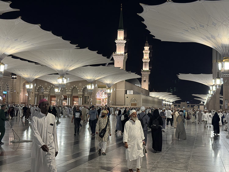 Hacılar, Mekke'den sonraki ikinci durakları olan Medine'de otellerine yerleşmelerinin ardından ilk olarak Mescid-i Nebevi'ye (Peygamber'in mescidi) giderek Hazreti Peygamber'i selamlıyor.