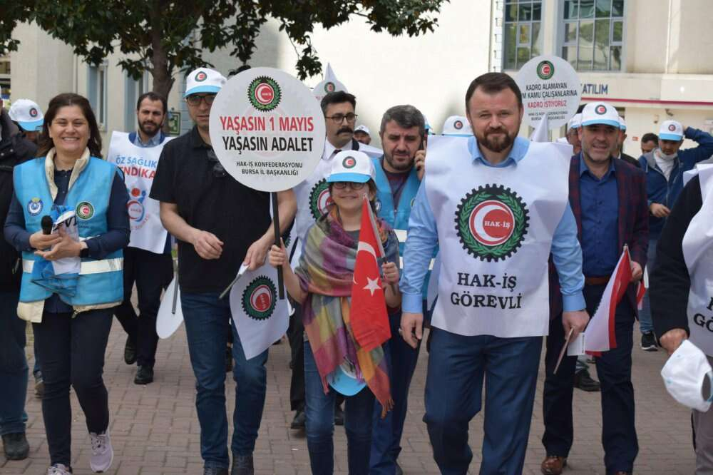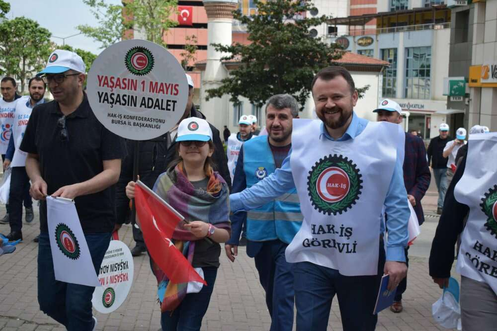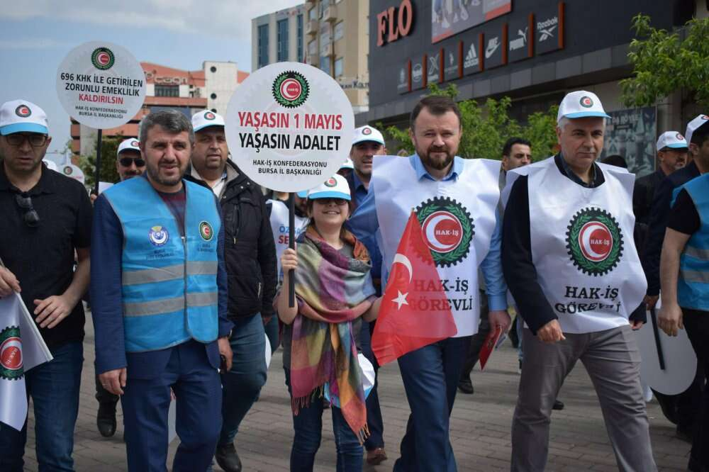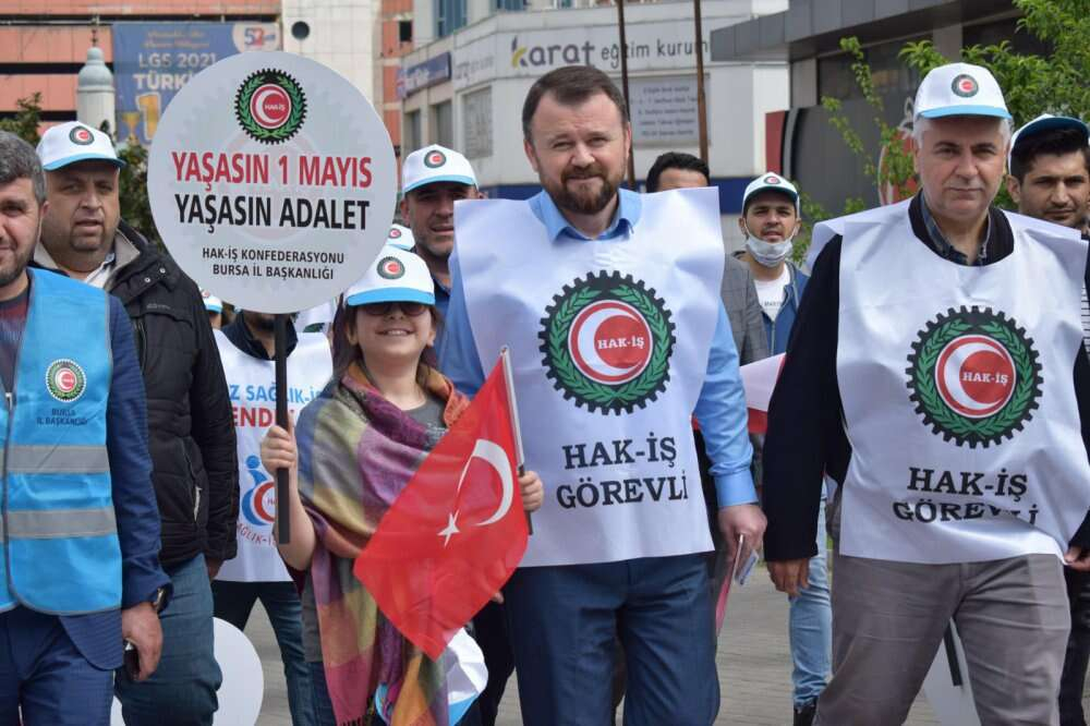 HAK-İŞ Konfederasyonu Bursa Şube Başkanlığı öncülüğünde, 1 Mayıs Emek ve Dayanışma Günü’nde işçiler Şehreküstü 15 Temmuz Meydanında bir araya geldi. Hak İşçi Sendikaları Konfederasyonu (HAK-İŞ) Bursa Şubesi Başkanı Mustafa Yavuz okuduğu bildiride,