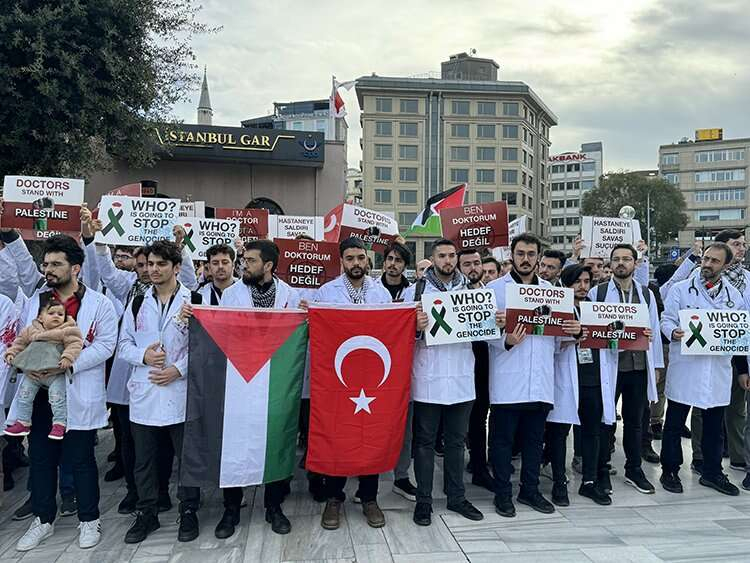 Beyoğlu'ndaki Karaköy İskelesi önünde bir araya gelen hekimler, ellerinde taşıdıkları Türk ve Filistin bayrakları ile İsrail aleyhine Türkçe ve İngilizce yazıların yer aldığı dövizler eşliğinde Sirkeci Tren Garı'na kadar yürüdü.