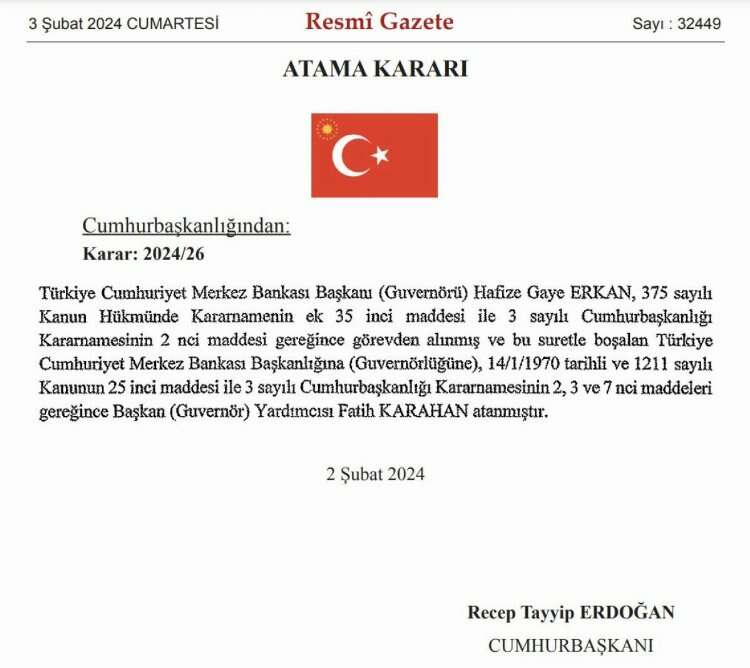 Resmi Gazete'de yayımlanan Cumhurbaşkanı Kararı'na göre, Merkez Bankası Başkanlığı görevine, Başkan Yardımcısı Fatih Karahan atandı