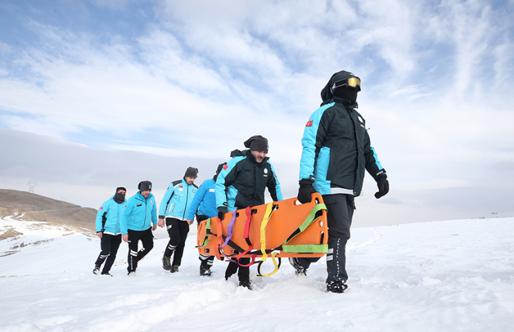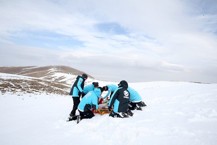Karla kaplı arazide kilometrelerce yürüyerek kış şartlarına adaptasyonlarını artıran sağlık çalışanları, senaryo gereği hayvanlarını aramak için çıktığı bölgede kaybolan çobanı kurtararak sedyeyle ambulansa taşıdı.