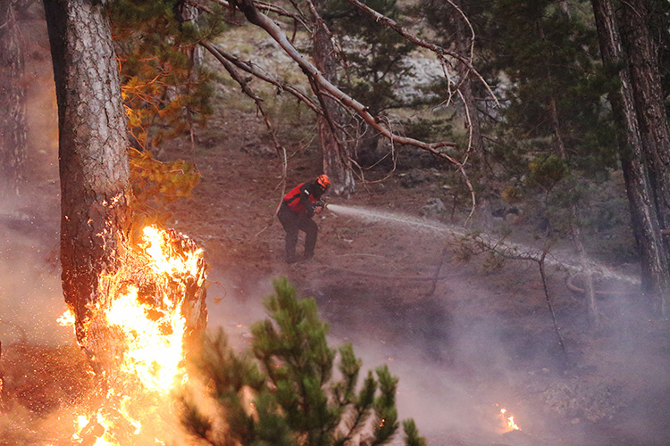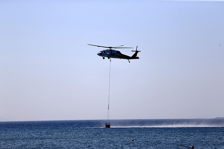Bölgedeki hava araçları, yangın havuzları ve denizden aldıkları suyu yanan alanlara taşıyor.