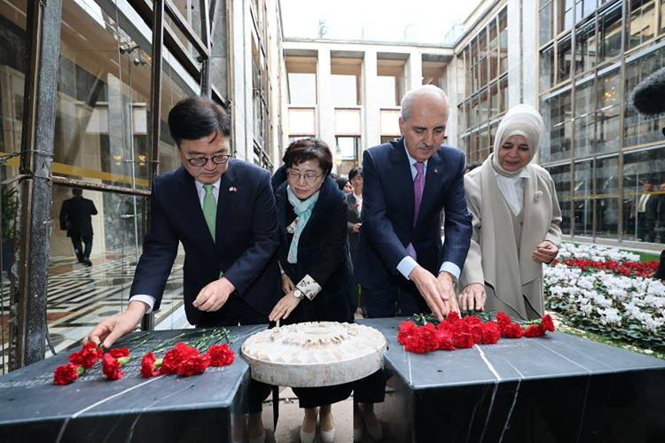 Kurtulmuş ve Woo Won-Shik, daha sonra FETÖ'nün 15 Temmuz'daki darbe girişimi sırasında Meclis'te bombaladığı alana karanfil bıraktı.