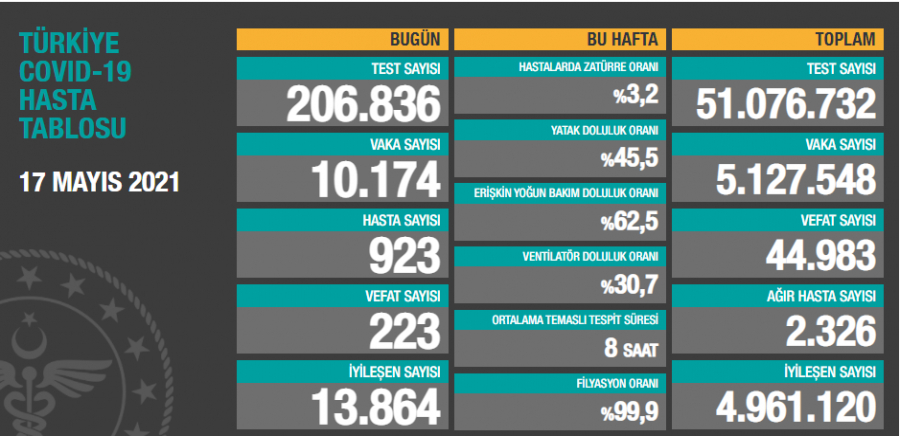 Sağlık Bakanlığı'nın internet sitesinde yer alan "Türkiye Günlük Koronavirüs Tablosu" güncellendi. Türkiye'de son 24 saatte 206 bin 836 Kovid-19 testi yapıldı, 10 bin 174 kişinin testi pozitif çıktı, 223 kişi hayatını kaybetti.