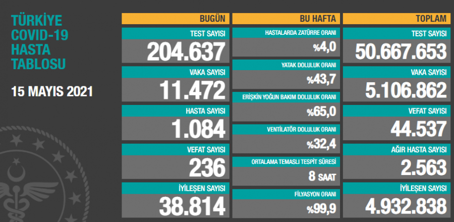 Türkiye'de son 24 saatte 204 bin 637 koronavirüs testi yapıldı, 11 bin 472 kişinin testi pozitif çıktı, 236 kişi hayatını kaybetti.