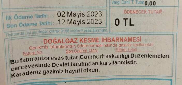 "Karadeniz gazımız hayırlı olsun" denilen mesajda ise, "Bu faturanıza esas tutar, Cumhurbaşkanlığı Düzenlemeleri çerçevesinde Devlet tarafından karşılanmıştır" ifadeleri kullanıldı.