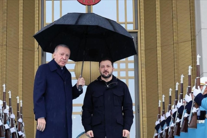 Fotoğrafta, Cumhurbaşkanı Erdoğan'ın yağmur altında konuk Devlet Başkanı Zelenskiy'yi de altına alacak şekilde bir şemsiye tuttuğu görülüyor.
