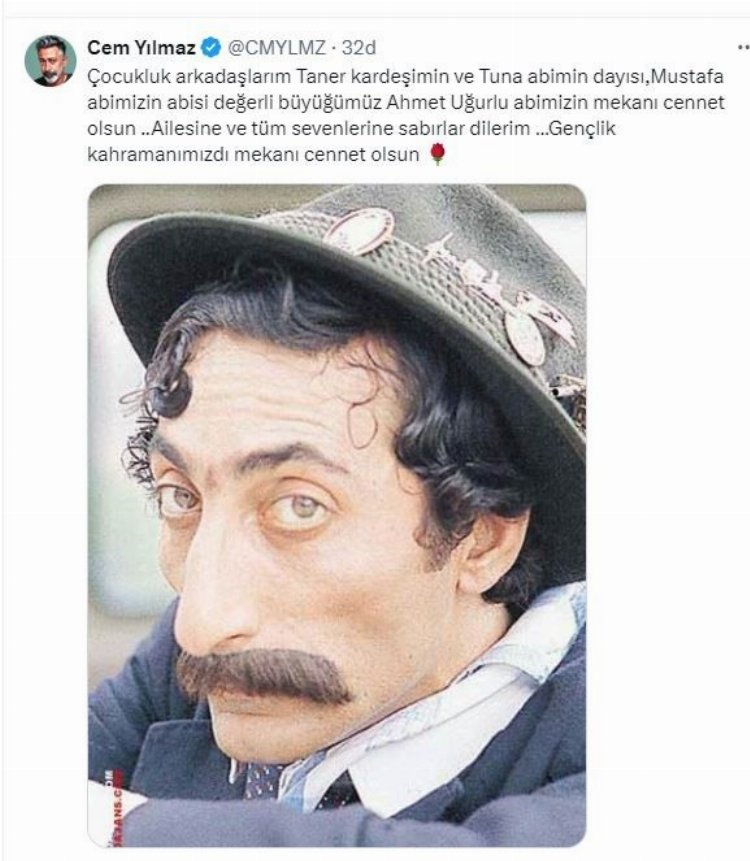 Cem Yılmaz ise üzüntülerini, "Çocukluk arkadaşlarım Taner kardeşimin ve Tuna abimin dayısı, Mustafa abimizin abisi değerli büyüğümüz AhmetUğurlu abimizin mekanı cennet olsun. Ailesine ve tüm sevenlerine sabırlar dilerim. Gençlik kahramanımızdı mekanı cennet olsun" ifadeleriyle dile getirdi.