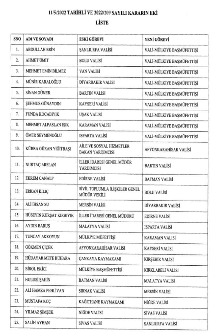 Kararla birlikte 20 ile yeni vali atandı. İstanbul ve Ankara'da ise görev değişimi olmadı.