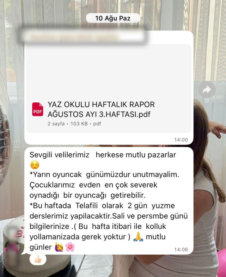 Kızı Berra'nın yüzme bilmediğini ancak buna rağmen okuldaki öğretmeninin veli grubundan mesaj atarak okula kolluksuz gönderilmesini istediğine dikkat çeken Beyza Turan "Berra'yı 3 yaşında kreşe yazdırdık. 1 yıldır kreşe gidiyordu. Okul bitince yaz okuluna gitmeye başladı. Yaz okulunda binicilik, yüzme ve jimnastik gibi etkinliklerin olacağı söylendi. Biz okulla bunun üzerine sözleşme imzaladık. Yüzme öğreteceklerini söylediler. Olaydan 2 gün önce Berra'nın sınıfından bir öğretmen veli grubundan mesaj atıp 12 Ağustos günü okula çocukları kolluksuz göndermemizi istedi. Bunun üzerine o gün kolluklarını yanına vermedik. Ne kolluk ne simit hiç bir şey yoktu çocukta. Daha önce hep kolluk kullanıyordu. Kızım daha suyun üzerinde bile duramıyordu. Kollukları takılı olsaydı bunlar yaşanmayacaktı" diye konuştu.