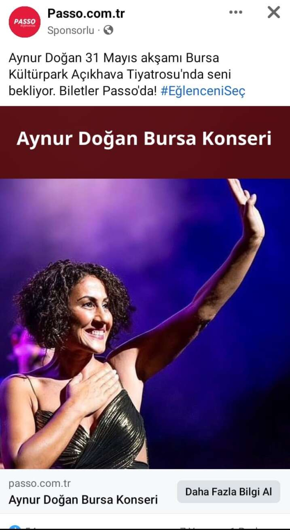 PKK sempatizanı ve terör örgütü lideri bebek katili Abdullah Öcalan sevdalısı Aynur Doğan isimli şarkıcının özel bir şirket tarafından Kültürpark Açıkhava Tiyatrosu’nda düzenlediği konser, Büyükşehir Belediyesi tarafından iptal edildi. Doğan’ın Bursa’da sahne alacak olması Bursalıların büyük tepkisine yol açmıştı.