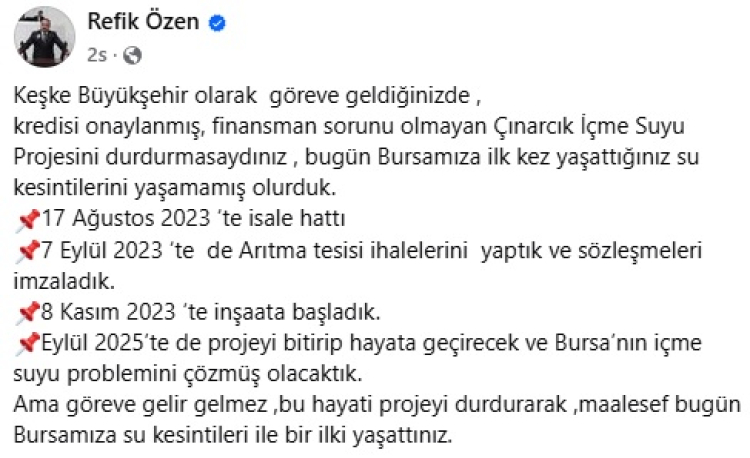 AK Parti Bursa Milletvekili Refik Özen, Bursa’da yaşanan su kesintilerine ilişkin sosyal medya hesabından dikkat çeken bir açıklama yaptı.