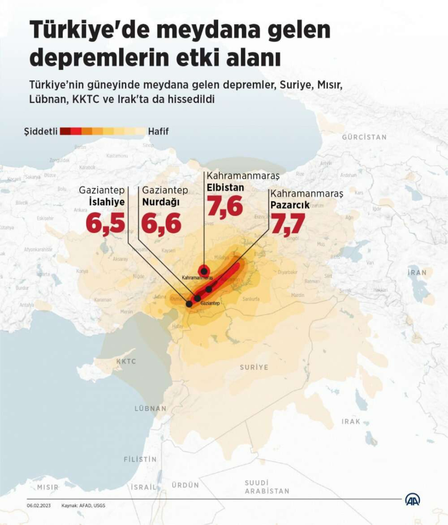 Türkiye Marmara Depremi’nden 24 yıl sonra bir büyük depremle daha sarsıldı. Türkiye’yi yasa boğan sarsıntılar Kahramanmaraş'ın Pazarcık ilçesinde saat 4.17'de 7,7; Elbistan ilçesinde saat 13.24'te 7,6 büyüklüğünde meydana gelirken, Gaziantep'te de büyüklükleri 6,4 ile 6,5 olan iki deprem meydana geldi. 11 şehirde yıkıma neden olan depremin ardından Türkiye bölge için seferber oldu. Devlet tüm gücüyle sahaya hakim olurken, ülkenin dört yanından yardım yağmuru yaşandı adeta.