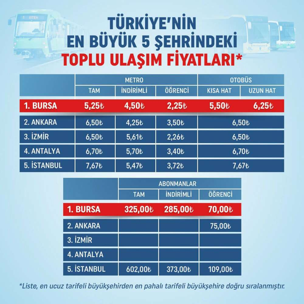 İstanbul, Ankara ve İzmir gibi büyük kentlerin ve insanların genellikle toplu ulaşımı kullandığı iller arasında en ekonomik il, Bursa oldu. Büyükşehirler bir bir zamlarla gündeme gelirken, İBB'nin ulaşıma yaptığı yüzde 40'lık zam büyük tepki topladı. Rusya'nın Ukrayna'ya savaş açmasının akaryakıt fiyatlarını yükselttiğini ileri süren belediyeler, ulaşımda zammı İl Meclislerinin alması yönünde zorladı. Ankara ve İzmir'den sonra İstanbul'a da yapılan zamların ardından en ucuz toplu ulaşım, Bursa Büyükşehir Belediye Başkanı Alinur Aktaş'ın yönetiminde Bursa'da vatandaşa sunulması dikkat çekti.