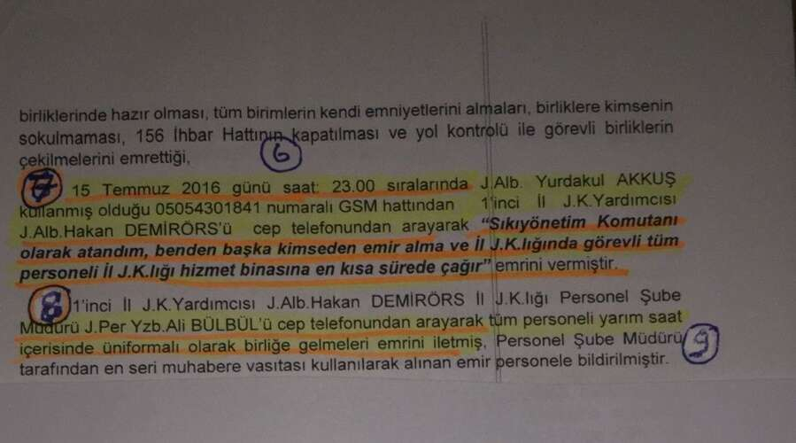 Tutanaklara baktığımızda o hain gecede Genel Kurmak Başkanlığından saat 22:30’da Bursa İl Jandarma Komutanı olan eski Albay Yurdakul Akkuş’a sıkıyönetim emri gönderilmiş, bu sıkıyönetim emrinde de darbeci albay Akkuş Bursa sıkıyönetim komutanı olarak görevlendirilmiş. Darbeci albay Akkuş, darbe emrini öğrenince tutanaklarda yazıldığı gibi saat 23:00’da herkesi bütün rütbeli askerleri İl Jandarma Garnizonuna çağırarak darbeyi başlatmış, bu emir bütün rütbelilere whatsup’tan iletilmiş, darbeci albay da Osmangazi’den lojmandan hareket edip jandarma garnizonuna gelip saat 23:10’da gizlice garnizona girmiş, genel kurmaydan gelen darbe emrini görevli assubaydan teslim almış, hemen bu emri Bursa’ya bağlı ilçe jandarma komutanlıklarına fakslatmış, garnizondaki makamına girmiş, saat 23:15’te garnizondaki makamda görevli 3 askere “gidin, silahlıktan silah ve mermi alın” emrini vermiş. Garnizondaki makamından verdiği telsiz emriyle tüm ilçe jandarmalardaki rütbelileri de darbeye çağırmış, saat 23:20’de jandarma garnizonundaki 156 imdat telefonunu kapatın emrini vermiş, halk ulaşmasın diye kapattırmış. Darbeci albay akkuş 23:40’a kadar tam yarım saatten fazla garnizonda bizzat FETÖ’cü darbeyi emir vererek yönetmiş. Ta ki bursa jandarma Bölge ve Garnizon Komutanı tümgeneral Seyfullah Saldık Paşa gelip nizamiyeden inip darbeyi önleyen, o tekme tokat darbeci dövmesi, silahlıkları kapattırmış ve o esnaya kadar darbeci albay garnizonu tamamen ele geçirip darbe yönetmiş.