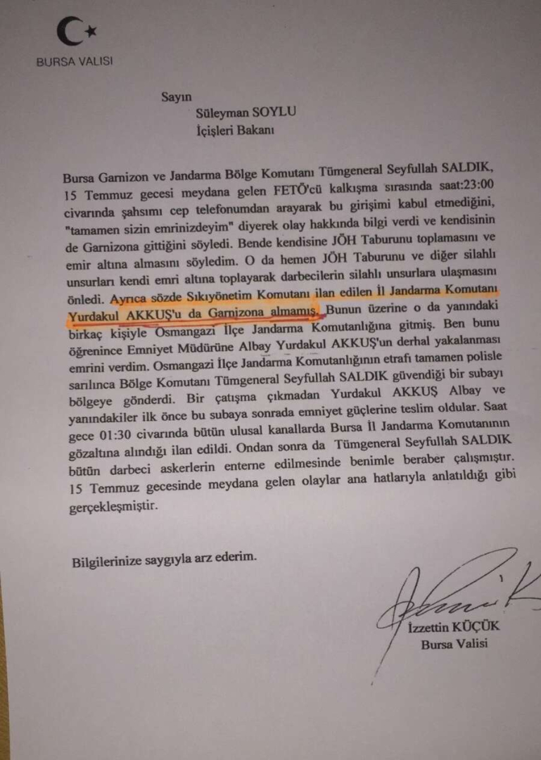 15 Temmuz kalkışması sırasında yaşanan olaylarla ilgili Bursa valisi olarak İzzettin Küçük’ün İçişleri Bakanlığına verdiği rapor, darbe kalkışmasının kilit noktasını adeta gölgeliyor. Eski Vali Küçük raporunda, FETÖ’nün sıkı yönetim komutanı ilan ettiği dönemin İl Jandarma Komutanı Yurdakul Akkuş’un Bursa Garnizon ve Jandarma Bölge Komutanı Tümgeneral Seyfullah Saldık tarafından garnizona alınmadığını yazıyor. Oysa Akkuş o gece garnizondaki odasına girmiş, telefonla kalkışmayı idare etmeye başlamış ve o sırada Seyfullah Saldık Paşa’nın müdahalesi ile dışarı atılmıştı.