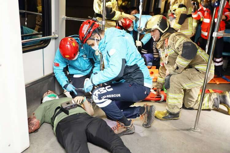 13 ülkeden 80 kişinin üzerinde yabancı uzman, 20 kurum katılımı, HAVELSAN ekibi, UMKE, Bursa Büyükşehir Belediyesi İtfaiye ve Akıllı Şehircilik Dairesi Başkanlıkları ile Burulaş ekiplerinin de katılımıyla 200’ü aşkın personelle kimyasal alan, yangın ve tren kazası tatbikatları gerçekleştirildi. Küçükbalıklı Afet Koordinasyon Merkezi’nde gerçekleştirilen kimyasal alan ve yangın tatbikatları gerçeği aratmazken, tren kazası tatbikatı ise adeta nefesleri kesti. Senaryo gereği metro, Nilüfer İstasyonu ile Odunluk İstasyonu arasındaki tünelden geçerken, deprem meydana geldi ve metro vagonu raylardan çıktı. Metrodaki yolculardan 21’i yaralanırken, olay yerine gelen ekipler, olaya son teknolojik donanımlarla müdahale etti. Müdahale ekipleri giyilebilir teknolojilerle donatılırken, ilk olarak olay yerine bir drone yönlendirildi. Olay yeri ve yaralı tespitleri öncelikle drone ile yapıldı. Bu tespitin ardından yürüyebilecek durumdaki yolcular, raylar üzerinde çıkış noktasına yönlendirilirken, müdahale ekipleri de vagona girerek içerideki yaralılarda durum tespiti yaptı. Bu tespit ekiplerin özel gözlükleri sayesinde kriz merkezinden de anlık takip edildi. Bu gözlem ve tespitlerin ardından da devreye UMKE ekipleri girdi. Yaralılara ilk müdahaleyi vagon içinde yapan ekipler, termal battaniyeye sardıkları yaralıları sedye ile raylar üzerinde istasyona kadar taşıdı. Yaklaşık 3 saat süren tatbikat, başarıyla tamamlandı.