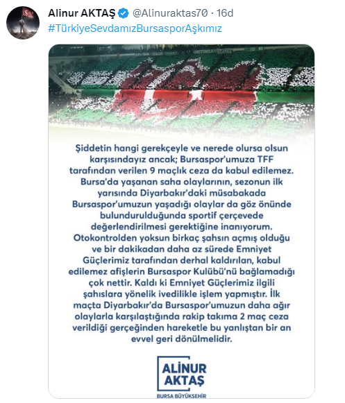 Cezanın açıklanmasının ardından önce taraftar grupları sosyal medyadan tepkilerini gösterirken, kent yöneticileri ve siyasilerden de tepkiler gecikmedi. Cezaya tepki gösteren Büyükşehir Belediye Başkanı Alinur Aktaş, “Şiddetin hangi gerekçeyle ve nerede olursa olsun karşısındayız ancak: Bursasporumuza TFF tarafından verilen 9 maçlık ceza da kabul edilemez. Bursa’da yaşanan saha olaylarının, sezonun ilk yarısında Diyarbakır’daki müsabakada Bursaspor’umuzun olaylar da göz önünde bulundurulduğunda sportif çerçevede değerlendirilmesi gerektiğine inanıyorum. Otokontrolden yoksun birkaç şahsın açmış olduğu ve bir dakikadan daha az sürede emniyet güçlerimiz tarafından derhal kaldırılan, kabul edilemez afişlerin Bursaspor Kulübü’nü bağlamadığı çok nettir. Kaldı ki emniyet güçlerimiz ilgili şahıslara yönelik ivedilikle işlem yapmıştır. İlk maçta Diyarbakır'da Bursaspor’umuzun daha ağır olaylarla karşılaştığında rakip takıma 2 maç ceza verildiği gerçeğinden hareketle bu yanlıştan bir an evvel dönülmelidir” ifadelerini kullandı.