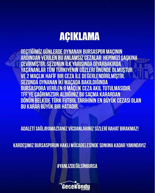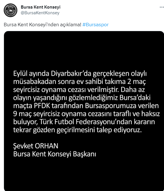 Bursaspor Kulübü, Amed Sportif Faaliyetler maçı sonrası PFDK’nın 9 maç seyircisiz oynama cezasına sert tepki gösterdi. Yeşil-beyazlı kulüpten yapılan açıklama şu şekilde: “Bu ceza bize değil tek çatı altında bir araya gelen tüm takımların vatansever taraftarlarına verilmiştir. Bilinsin ki gereken mücadele Bursaspor var olduğu sürece devam edecektir.”