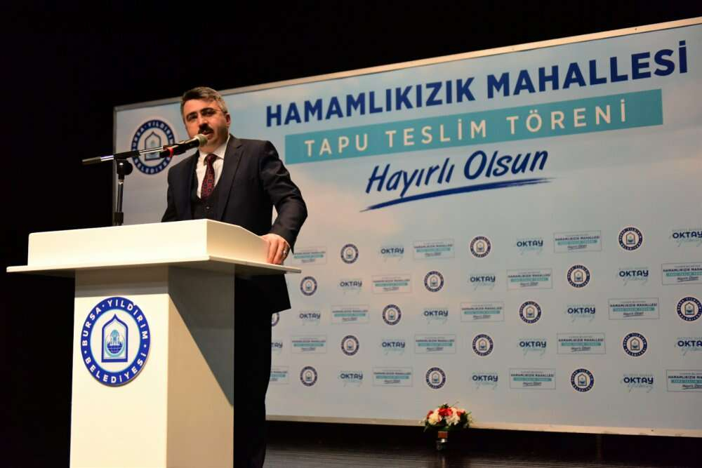 Hamamlıkızık Mahalle Muhtarı Feridun Çakır, “Bu hizmet için Yıldırım Belediye Başkanımız Sayın Oktay Yılmaz’a, tüm mahalle sakinlerimiz adına teşekkür ediyorum. Bu düzenleme ile birlikte hem 54 mahalle sakinimiz tapularına kavuştu hem de mahallemizde daha sağlıklı ve düzenli yaşam alanlarının oluşturulabilmesinin önünü açıldı. Ben bu hizmetin mahallemize ve mahalle sakinlerimize hayırlı olmasını diliyorum ve tekrardan başkanımıza teşekkür ediyorum” dedi. İmar kanunu uygulaması sonucunda oluşan yeni imar parsellerine yönelik tapu teslim töreni Yıldırım Belediye Başkanı Oktay Yılmaz’ın ve Yıldırım İlçe Tapu Müdürü Enes Gezmiş’in hak sahiplerine tapularını teslim etmesiyle sona erdi.