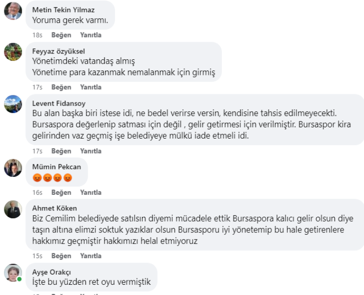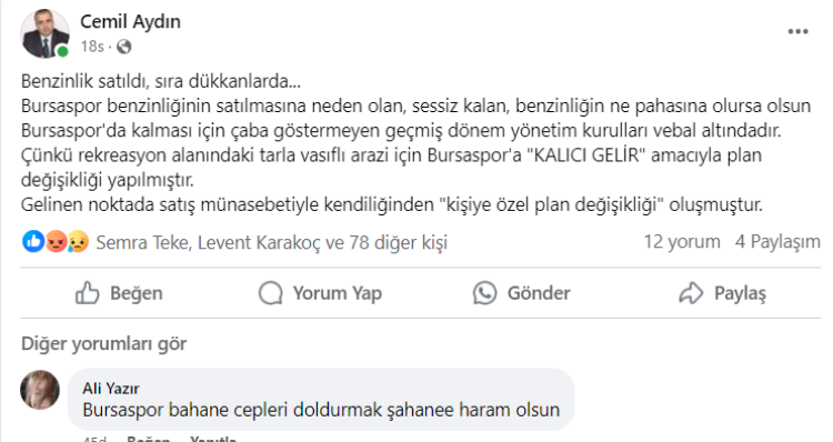 Bursaspor Kulübü’nün açıklaması yeni bir tartışmayı da beraberinde getirdi. Açıklamaya göre Bursaspor benzin istasyonunu değerinin neredeyse yarı fiyatına yönetim kurulu üyesi aldı. Satışa tepki gösteren isimlerin başında Osmangazi Belediyesi eski Meclis Üyesi Cemil Aydın geliyor. Daha önce de bir çok kez benzinliğin satılmaması gerektiğini, burada kamunun Bursaspor için bir plan değişikliğine gittiğini, satış olduğu takdirde bunun kişiye özel bir plan değişikliği haline geleceğini ve Bursaspor’a sağlanan ayrıcalıkların doğru kullanılmamış olacağına dikkati çekmişti. Satışın ardından Aydın sosyal medya hesabından yaptığı paylaşımda bir kez daha tepkisini dile getirdi. Aydın, “Benzinlik satıldı, sıra dükkanlarda... Bursaspor benzinliğinin satılmasına neden olan, sessiz kalan, benzinliğin ne pahasına olursa olsun Bursaspor'da kalması için çaba göstermeyen geçmiş dönem yönetim kurulları vebal altındadır. Çünkü rekreasyon alanındaki tarla vasıflı arazi için Bursaspor'a "KALICI GELİR" amacıyla plan değişikliği yapılmıştır. Gelinen noktada satış münasebetiyle kendiliğinden "kişiye özel plan değişikliği" oluşmuştur.” İfadelerini kullandı. Aydın’ın paylaşımının altına dönemin MHP Büyükşehir Meclis Üyesi İhsan Bilgisi de tepki gösteren isimlerden birisi oldu. Bilgili, “Normalde red oyu vermemiz gereken Bursaspor benzinlik imarına Büyükşehir Meclisinde Mhp Grubu olarak kabul oyu kullandık. Sayıştay sorumluluğunu da göze alarak evet dedik. Bu durumu öngörerek bizleri aldatıp ileride bu benzinliğin satılmaması şartıyla evet dedik. Satılsın diye imar çıkarmadık biz...Mümkünse İmarın iptal edilmesi gerekir” ifadelerini kullandı.