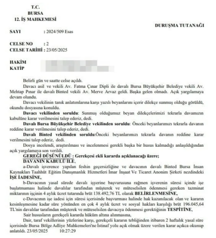 İş Mahkemesinde, göreve iade davası açan engelli personel Ömercan Yurteri, "5 Kasım 2024 tarihinde tek taraflı olarak iş akdim feshedildi. Bursa Büyükşehir Belediye Başkanlığı ve Binted Bursa insan kaynakları Ticaret Anonim Şirketi ile Bursa 12 İş Mahkemesi tarafından yürütülen işe iade istemli davamda haksız yere işten çıkarıldığım, mahkemece kesin karara bağlandı. İstinaf yolunun 2 hafta açık olacağı belirtildi. Engelli bir personel olarak kamunun engellileri istihdam etmesi üzerine yaklaşık 5 yıl kadar çalışmış olduğum Bursa Büyükşehir Belediyesi’ne duymuş olduğum aidiyetle birlikte işime devam etmek istiyorum. Bursa Büyükşehir Belediyesi'nin bir an önce vermiş olduğu yanlış karardan dönerek mahkeme kararının da geçerliliği göz önünde bulundurularak işime geri dönmek istiyorum" dedi.