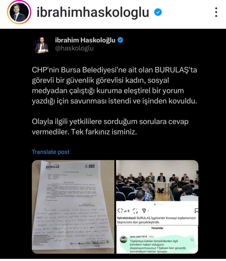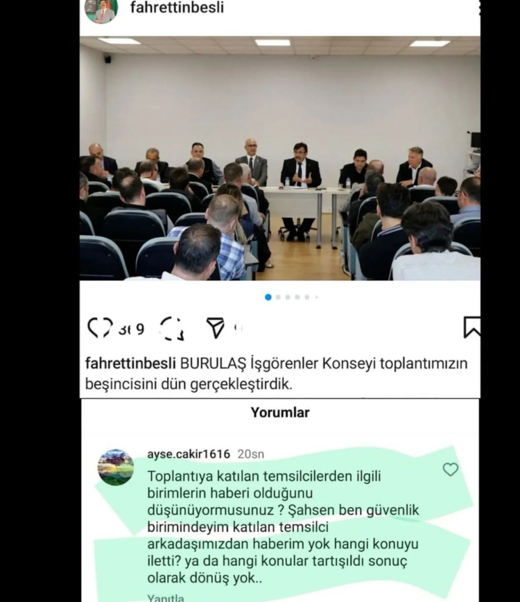 Sosyal medyada yer alan haberlere göre Burulaş’ta güvenlik personeli ile yapılan toplantının ardından Burulaş Genel Müdürü Fahrettin Beşli, sosyal medya hesabından “Burulaş işgörenler konseyi toplantılarımızın 5.incisini dün gerçekleştirdik” paylaşımı yaptı. Bu paylaşımın altına yorum yapan Büyükşehir Belediyesi güvenlik görevlilerinden Ayşe Çakır, “Toplantıya katılan temsilcilerden ilgili birimlerin haberi olduğunu düşünüyor musunuz? Şahsen ben güvenlik birimindeyim katılan temsilci arkadaşımızdan haberim yok. Hangi konuyu iletti? Ya da hangi konular tartışıldı sonuç olarak dönüş yok” yorumunu yaptı.