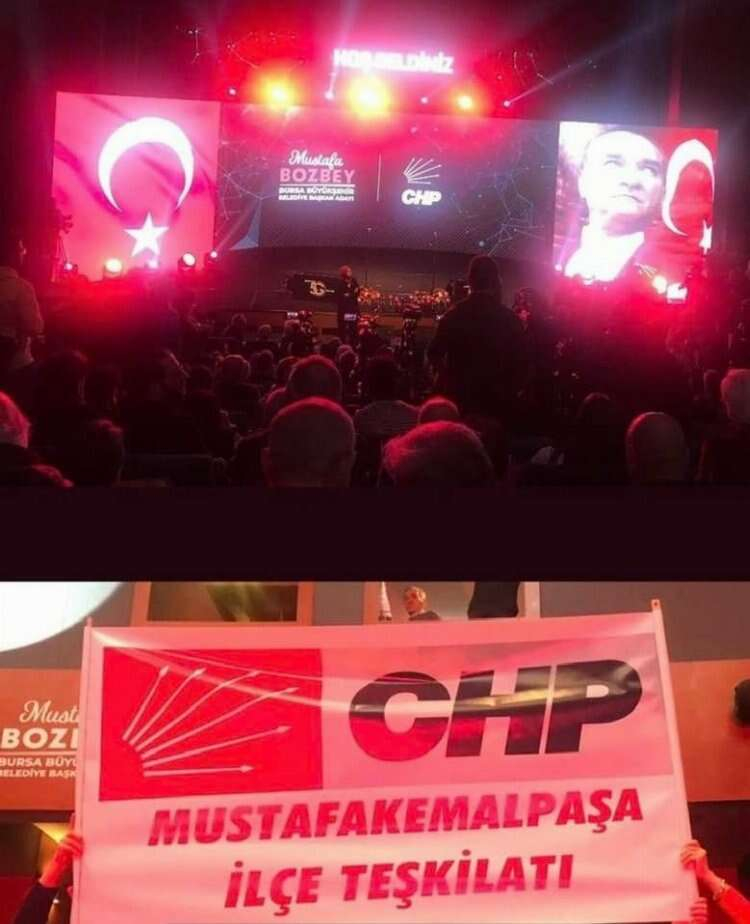 CHP Genel Başkanı Özgür Özel’in de katıldığı BAOB Salonu’ndaki Büyükşehir Belediye Başkan Adayı Mustafa Bozbey’in proje tanıtım toplantısında açılan bir pankart ortalığı karıştırdı.