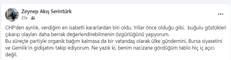 Serintürk bir başka paylaşımında da CHP’den ayrılmanın hayatında verdiği en doğru kararlardan biri olduğunu söyledi. Bursa ve Gemlik siyasetini takip ettiğini, durumun hiç iç açıcı olmadığını vurgulayan Serintürk, paylaşımında şunlara yer verdi; “ CHP’den ayrılık, verdiğim en isabetli kararlardan biri oldu. Yıllar önce olduğu gibi, buğulu gözlükleri çıkarıp olayları daha berrak değerlendirebilmenin özgürlüğünü yaşıyorum. Bu süreçte partiyle organik bağım kalmasa da bir vatandaş olarak ülke gündemini, Bursa siyasetini ve Gemlik’in gidişatını takip ediyorum. Ne yazık ki, benim nacizane gördüğüm tablo hiç iç açıcı değil.”