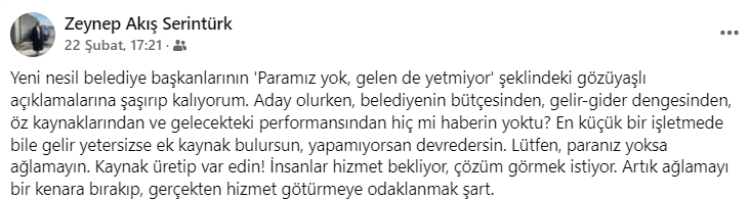 Son dönemde özellikle CHP’li belediye başkanlarının “Para yok, gelen de yetmiyor” serzenişlerine tepki gösteren Serintürk, “Yeni nesil belediye başkanlarının 'Paramız yok, gelen de yetmiyor' şeklindeki gözüyaşlı açıklamalarına şaşırıp kalıyorum. Aday olurken, belediyenin bütçesinden, gelir-gider dengesinden, öz kaynaklarından ve gelecekteki performansından hiç mi haberin yoktu? En küçük bir işletmede bile gelir yetersizse ek kaynak bulursun, yapamıyorsan devredersin. Lütfen, paranız yoksa ağlamayın. Kaynak üretip var edin! İnsanlar hizmet bekliyor, çözüm görmek istiyor. Artık ağlamayı bir kenara bırakıp, gerçekten hizmet götürmeye odaklanmak şart” dedi.
