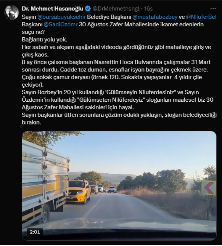 İYİ Parti Bursa eski İl Başkanı Mehmet Hasanoğlu önceki gün sosyal medya hesabından Büyükşehir Belediye Başkanı Mustafa Bozbey ve Nilüfer Belediye Başkanı Şadi Özdemir’i hitaben bir paylaşım yaptı. Her iki başkana da Nilüfer 30 Ağustos Zafer Mahallesi’nde yaşanan bağlantı yolu sorununu hatırlatan Hasanoğlu, “Sayın Bursa Büyükşehir Belediyesi Başkanı Mustafa Bozbey ve Nilüfer Belediyesi Başkanı Şadi Özdemir 30 Ağustos Zafer Mahallesinde ikamet edenlerin suçu ne? Bağlantı yolu yok. Her sabah ve akşam aşağıdaki videoda gördüğünüz gibi mahalleye giriş ve çıkış kaos” ifadelerini kullandı.