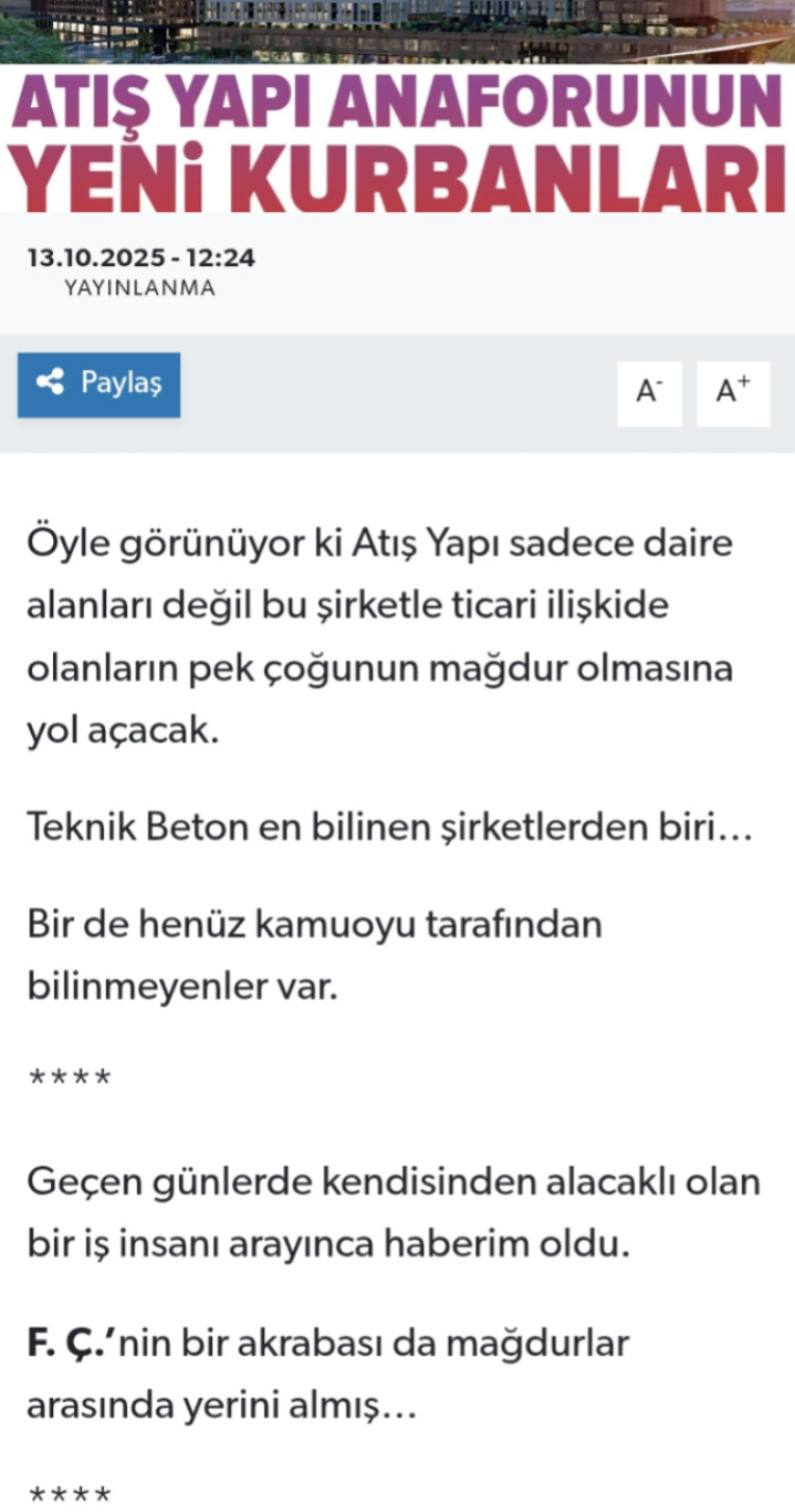 Bursa Saati köşe yazarı Yüksel Baysal seri haline gelen Atış Yapı yazılarına bir yenisini ekledi. Baysal, ‘’Atış Yapı Anaforunun yeni mağdurları” başlığını taşıyan yazısında F.Ç. isimli bir kişiden bahsediyor ve bir akrabasının da mağdurlar arasında olduğunu söylüyor.