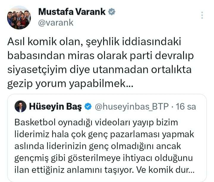 Bursa Milletvekili Mustafa Varank, geçtiğimiz günlerde Cumhurbaşkanı Recep Tayyip Erdoğan ile yaptıkları basketbol maçından video görüntülerini dün sosyal medya hesabından paylaşmıştı. Merhum siyasetçi Haydar Baş’ın oğlu Hüseyin Baş, Cumhurbaşkanı Erdoğan’ın genç gösterilmeye çalışıldığı yönündeki eleştiride bulunarak “komik” yorumu yaptı. Bağımsız Türkiye Partisi Genel Başkanı Hüseyin Baş’ın, “Basketbol oynadığı videoları yayıp bizim liderimiz hala çok genç pazarlaması yapmak aslında liderinizin genç olmadığını ancak gençmiş gibi gösterilmeye ihtiyacı olduğunu ilan ettiğiniz anlamını taşıyor. Ve komik duruyor” yorumuna Varank’tan yanıt gecikmedi. Varank bu yoruma, “Asıl komik olan, şeyhlik iddiasındaki babasından miras olarak parti devralıp siyasetçiyim diye utanmadan ortalıkta gezip yorum yapabilmek...” şeklinde yanıt verdi.