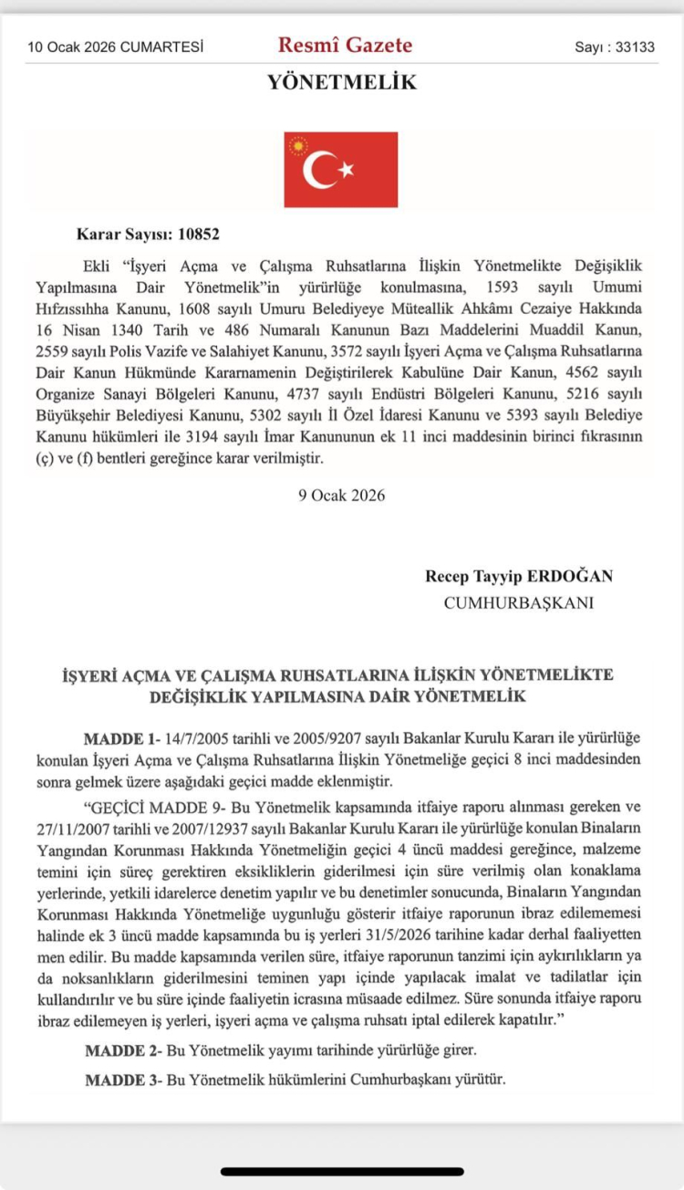 Cumhurbaşkanlığı Kararnamesi ile yapılan düzenlemede İşyeri açma ve çalışma ruhsatlarına ilişkin yönetmelikte değişikliğe gidildi. Resmi Gazete’de yayımlanan düzenlemeye göre, yangın güvenliği eksiklerini gidermeyen ve itfaiye raporu alamayan iş yerlerine 31 Mayıs 2026’ya kadar süre tanındı. Bu tarihten sonra rapor ibraz etmeyen işyerlerinin ruhsatı iptal edilerek kapatılacak. Resmi Gazete’de yayımlanan “İşyeri Açma ve Çalışma Ruhsatlarına İlişkin Yönetmelikte Değişiklik Yapılmasına Dair Yönetmelik” ile mevcut yönetmeliğe geçici 9. madde eklendi. Geçici maddeye göre, yönetmelik kapsamında itfaiye raporu alınması gereken ve Binaların Yangından Korunması Hakkında Yönetmelik hükümlerine tabi işyerlerinde, yangın güvenliğine ilişkin eksikliklerin giderilmesi amacıyla denetim yapılacak. Bu kapsamda, yapı ve malzeme teminine ilişkin imalat ve tadilatların tamamlanması ve itfaiye raporunun alınması için 31 Mayıs 2026 tarihine kadar süre tanınacak. 31 Mayıs 2026 itibarıyla itfaiye raporu ibraz etmeyen işyerlerinin işyeri açma ve çalışma ruhsatları iptal edilecek ve söz konusu işyerleri kapatılacak.