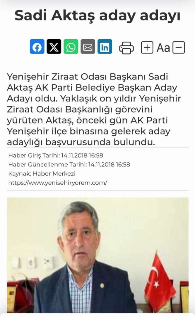 CHP Yenişehir Belediye Başkanlığı için Ziraat Odası Başkanı Sadi Aktaş’ı aday gösterdi. Sadi Aktaş’ın bir önceki seçimde ise AK Parti’den aday adayı olduğu ortaya çıkarken, Ziraat Odası Başkanlığı’ndan ne zaman istifa ettiği de tartışma konusu oldu. Öte yandan Yenişehir’de 5 bin çiftçinin emekliliklerindeki sorunun Sadi Aktaş’ın yönettiği Ziraat Odası kaynaklı olduğu ileri sürülüyor.