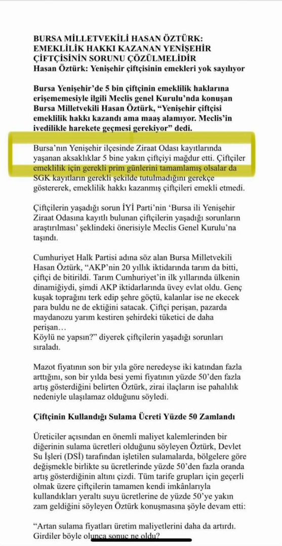 Çiftçilerin Ziraat Odası kayıtlarından kaynaklanan sorunlar nedeniyle emeklilik haklarını alamamalarına yönelik sorunun çözümü için Cumhur İttifakı MHP Yenişehir Belediye Başkanı Davut Aydın devreye girdi. Davut Aydın Ankara’ya çıkarma yaparak sorunun çözümü için girişimler başlatırken, yaşanan sorunu kamuoyuna da sosyal medya hesabından aktardı. Aydın açıklamasında, “İlçemizde Tarım Bağ-kuruyla ilgili Ziraat Odası Kayıtlarından Kaynaklanan sorunlardan dolayı, emeklilik hakları konusunda mağduriyet yaşayan vatandaşlarımızın sorunlarının çözümü amacıyla; MHP İlçe Başkanımız Arif Eren, Ak Parti İlçe Başkanvekilimiz Adem Yılmam ve mağduriyet yaşayan 20’ye yakın çiftçimizle birlikte, Sosyal Güvenlik Kurumu Başkanı Dr. Raci Kaya, MHP Bursa Milletvekilimiz Fevzi Zırhlıoğlu, Ak Parti Bursa Milletvekilimiz Ayhan Salman, Ak Parti Bursa Milletvekilimiz Ahmet Kılıç ile olumlu yönde görüşmeler gerçekleştirdik. Yakın ilgi ve alakalarından dolayı ilçemiz adına emeği geçen herkese teşekkür ederim” ifadelerini kullandı.