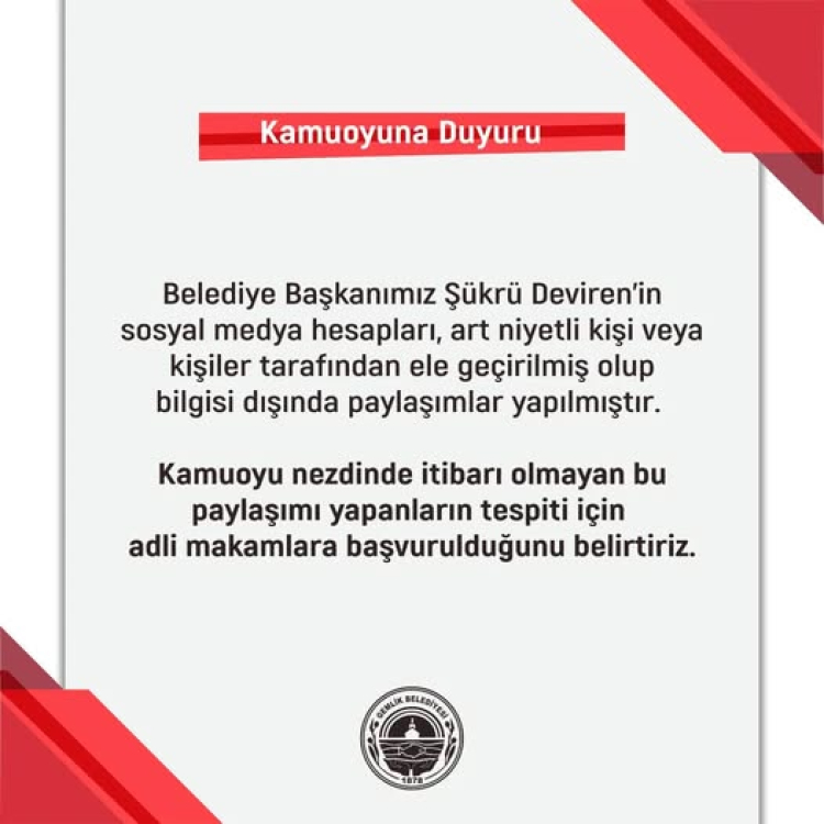 Deviren’in hesabının ele geçirilmesinin ardından "Gerçekleri ortaya çıkarın! Kim haklı, kim haksız, detaylı bir şekilde inceleyin. Kim, nereden, ne şekilde ve kimlerle beraber usulsüzlük yapıp başkalarının alın terini ve ekmeğini çalmışsa, onun cezasını verin" şeklinde bir paylaşım yapıldı. Hesabın ele geçirilmesi ve mesaj yayımlanmasının ardından Gemlik Belediyesi açıklama yaparak, hesabın çalınmasıyla ilgili adli makamlara gereken başvuruların yapıldığı bildirildi. Gemlik Belediyesi resmi hesaplarından yapılan açıklama şöyle; “ Kamuoyuna Duyuru Belediye Başkanımız Şükrü Deviren'in sosyal medya hesapları, art niyetli kişi veya kişiler tarafından ele geçirilmiş olup bilgisi dışında paylaşımlar yapılmıştır. Kamuoyu nezdinde itibarı olmayan bu paylaşımı yapanların tespiti için adli makamlara başvurulduğunu belirtiriz.”