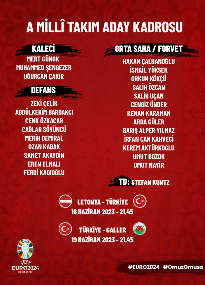 A Milli Takımımızın, 2024 Avrupa Şampiyonası Elemeleri'nde Letonya ve Galler ile oynayacağı karşılaşmaların aday kadrosu belli oldu.