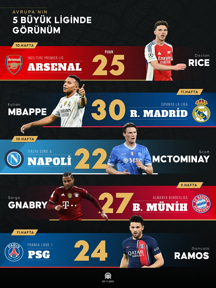 İspanya'da Real Madrid, İngiltere'de Arsenal, İtalya'da Napoli, Almanya'da Bayern Münih ve Fransa'da Paris Saint-Germain (PSG), puan tablosunun zirvesinde yer aldı.